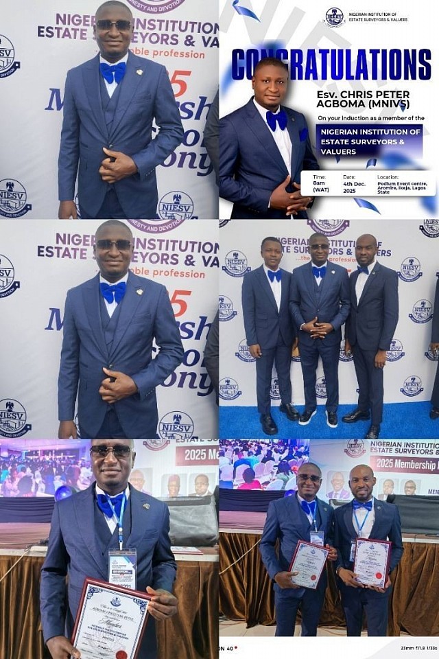 He has been officially inducted into the Nigerian Institution of Estate Surveyors and Valuers (NIESV) at the national level — a prestigious professional achievement that reflects excellence, hard work, and dedication to the profession.